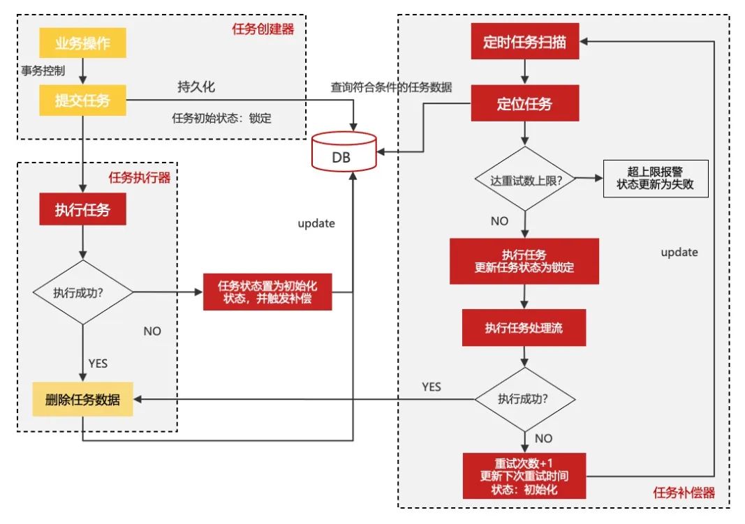 (图3 JMQ解决回调取消接口失败)这样一来,业务系统的稳定性与JMQ中间件的稳定性就强关联了,自然对JMQ的稳定性有较高要求。为了降低对JMQ的强依赖,保证业务的顺利执行,通过技术手段提升用户体验,减轻研发值班人员压力,最终形成了任务重试工具。其核心思想是将分布式事务拆分成本地事务进行处理,具体实现方式是:将任务落库,保证业务操作表与纯任务表在同一个数据库,通过数据库事务保证业务操作与任务持久化的强一致性。在一定程度上,将业务操作与中间件依赖解耦。采用回调函数的机制实现调用者和底层驱动的解耦,提升了组件的灵活性,对业务侵入性小。